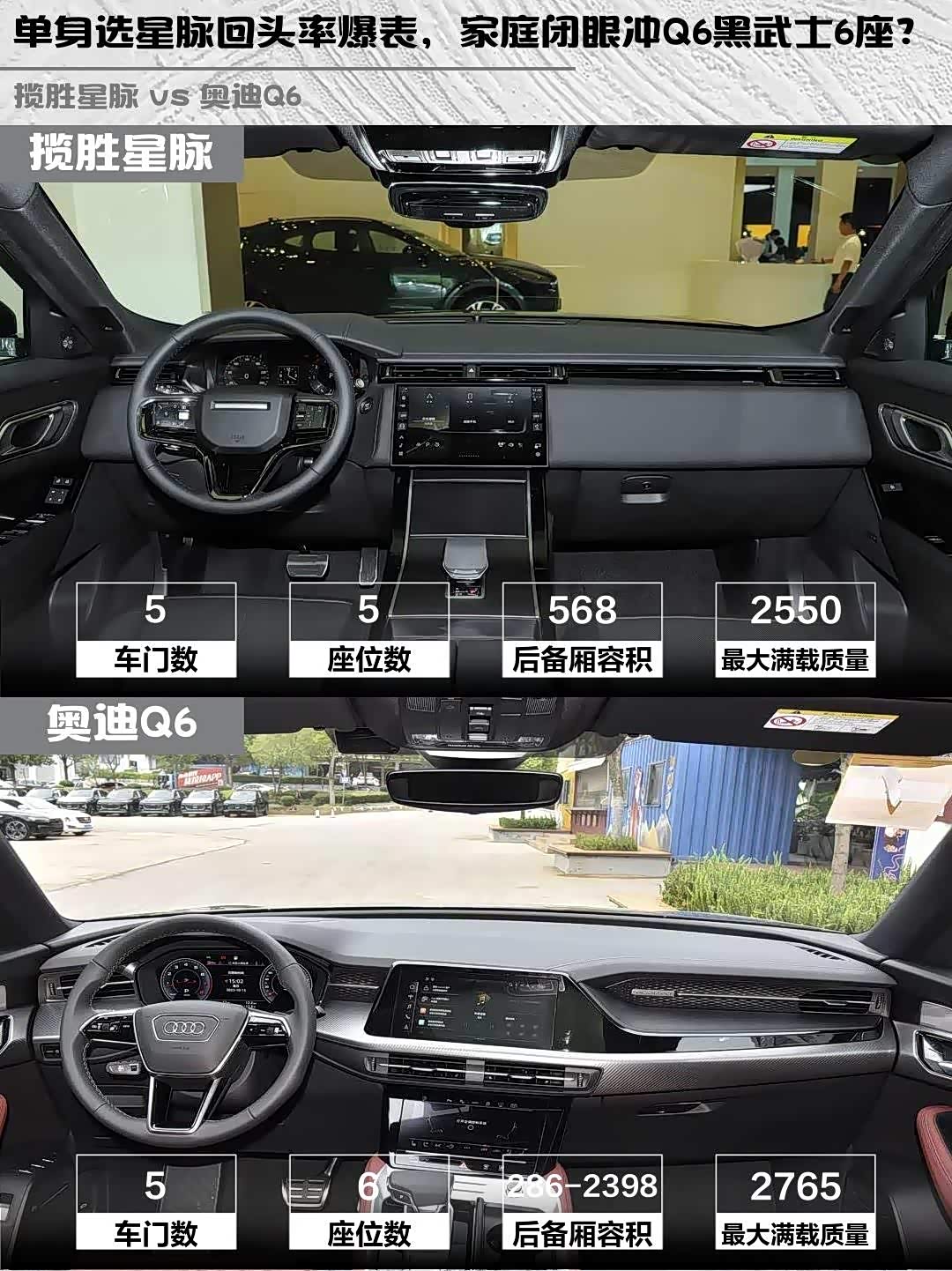单身贵族或小两口选星脉准没错,颜值即正义!家里有二胎或经常全家出游,Q6的6座实用性和超大空间会更香。两款车风格差异明显,建议一定要去试驾,感受下英式优雅和德系硬朗的不同魅力~