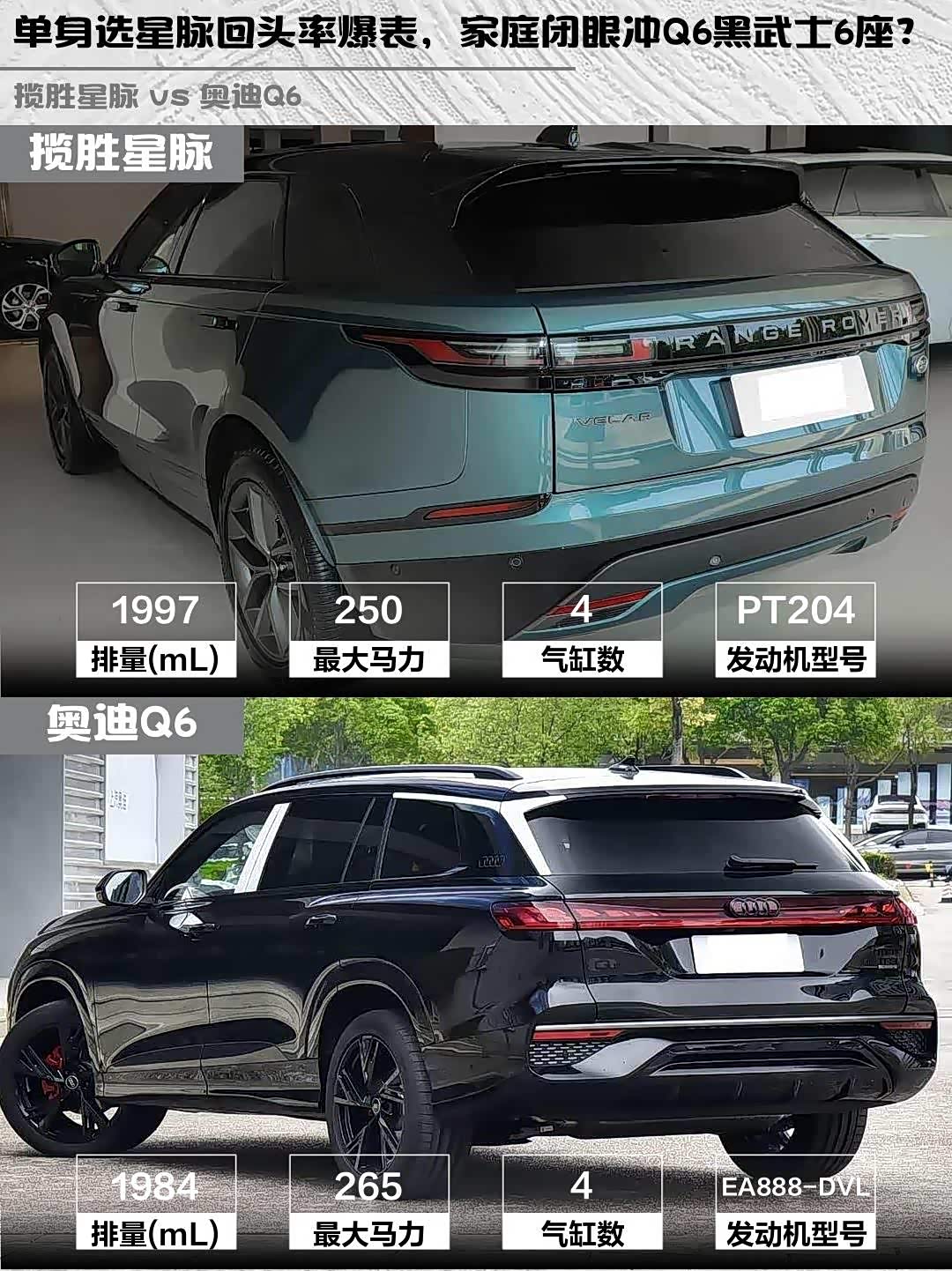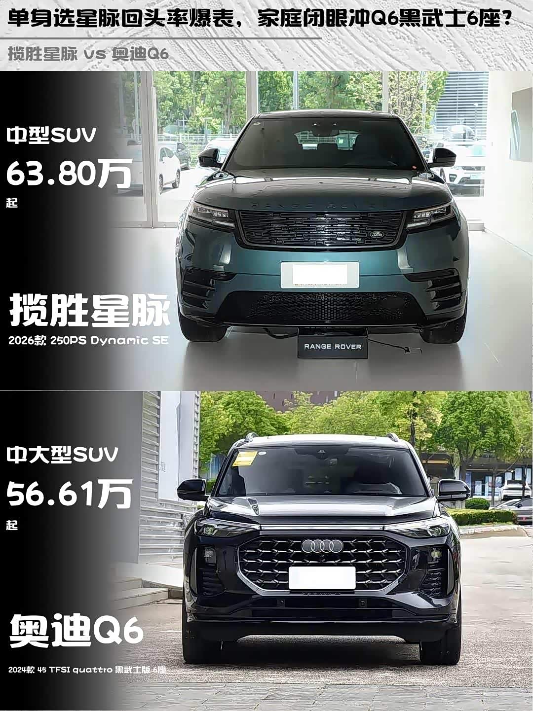 最近在纠结中型豪华SUV的小伙伴看过来!今天深度对比两款热门车型—— 揽胜星脉(参数|询价)2026款250PS Dynamic SE和奥迪Q6 2024款45 TFSI quattro黑武士版6座,帮你选车不踩雷✨