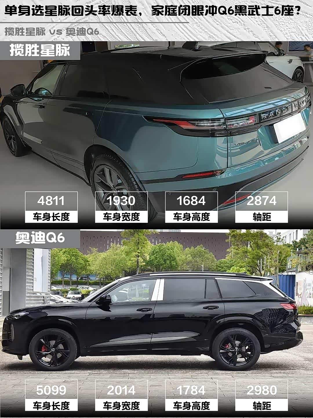 揽胜星脉不愧是"最美路虎",流线型车身+悬浮车顶设计,开出去回头率爆表💫 11.4英寸中控屏搭配极简内饰,科技感拉满。奥迪Q6黑武士版则走硬汉路线,全黑外观+矩阵大灯,5099mm的超长车身气场全开,更适合喜欢霸气风格的你。