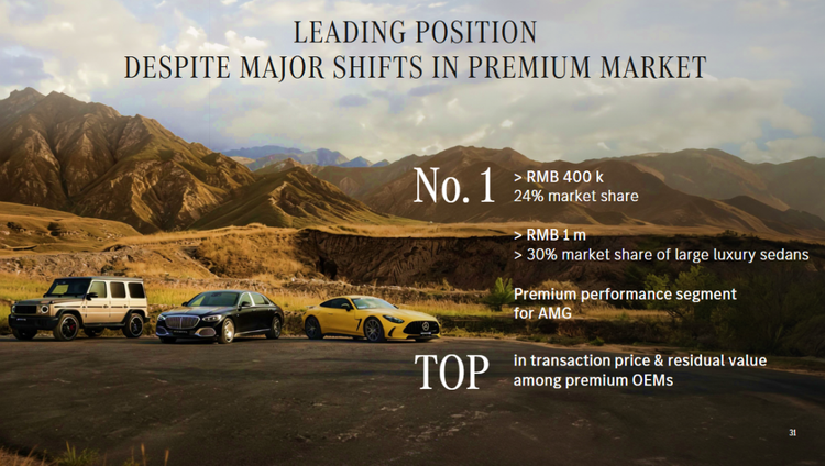 在中国市场,奔驰专门进行中国战略更新的解读。奔驰表示,中国豪华车市场目前格局已经发生了剧烈变化,但从高端豪华市场来看奔驰还处于稳居领先地位。比如在中国售价超40 万元高端市场,奔驰市占率24%,位列第一。而在售价超100 万元超豪华市场,奔驰的大型豪华轿车市占率超30%。奔驰的AMG 品牌在豪华性能车市场中,交易价格与残值率均位列豪华车企第一。