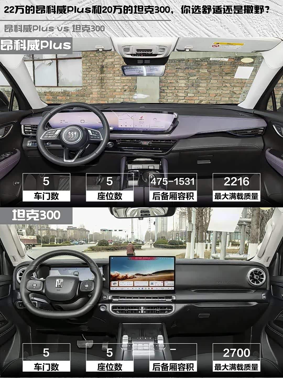 昂科威Plus的4822mm车长直接比坦克300长了72mm,后排腿部空间能轻松跷二郎腿,后备箱常规475L容积+可放倒设计,家庭露营装备随便装。而坦克300的方盒子造型牺牲了后排头部空间,但1930mm超宽车身+非承载式底盘,过炮弹坑时车身稳如老狗,越野老炮懂的都懂!