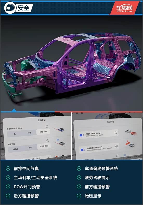 安全配置方面,评测车的主/被动安全配置较为丰富,除了常规功能之外,还配备了前排中间气囊、车道偏离预警系统、主动刹车/主动安全系统、疲劳驾驶提示以及前方碰撞预警等配置,能够为日常行驶提供全方位的安全防护。