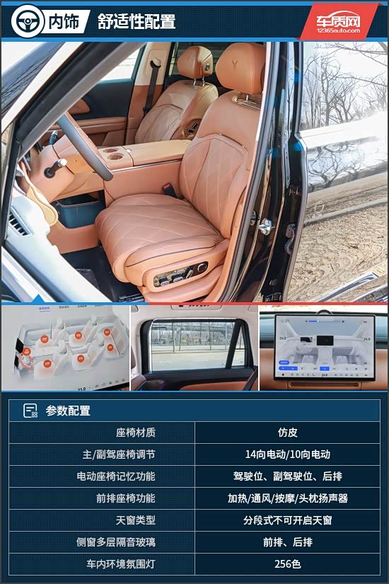前排座椅柔软贴合,不仅带有加热、通风配置,更配备靠背10点式和座垫6点式按摩系统,大幅提升驾乘舒适度与体验感。另外,第二排右侧专属AI云舒座椅还支持零重力模式,打造舒享体验。