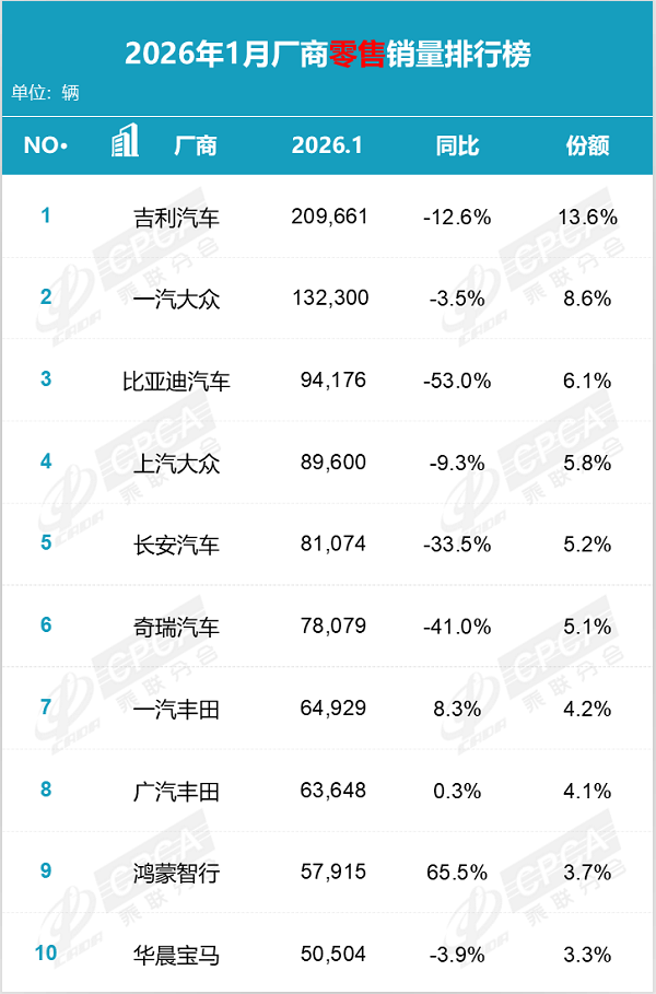 2026年1月份的国内车市,确实在某种意义上让人感受到了寒意。乘联会最新发布的2026年1月厂商零售销量排行榜,为全年的车市竞争投下了一枚深水炸弹。在传统的“开门红”月份,这份榜单非但未能带来普涨的喜讯,反而呈现出“大多车企销量下滑”冷峻图景。