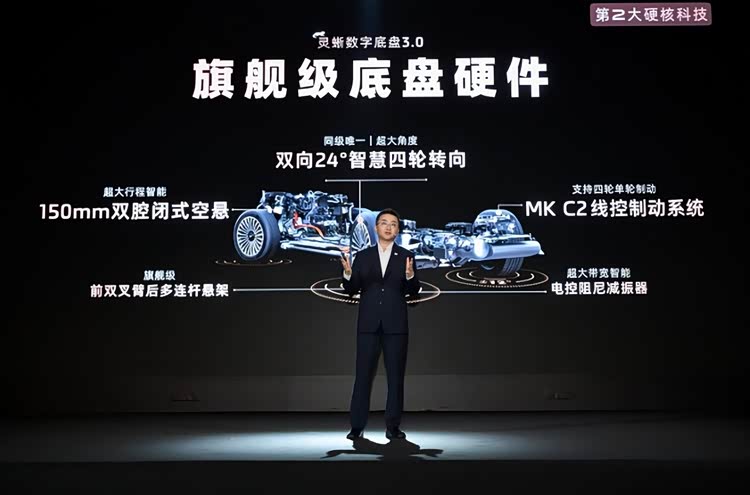 机械素质才是这台车的硬通货。全系标配灵蜥数字底盘3.0,这东西绝对不是噱头。一台车长接近五米三的庞然大物,塞进去了双向24度后轮转向,转弯半径直接缩到4.95米。