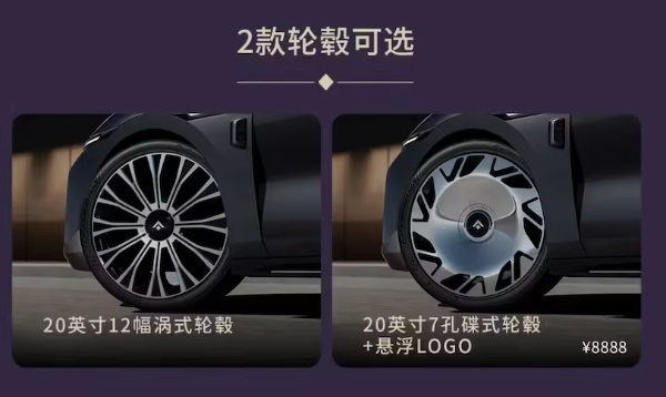轮毂有两种20英寸规格可选:12幅涡式轮毂和7孔蝶式轮毂。后者选装价8888元,带悬浮轮毂LOGO,转起来视觉效果会更炫。