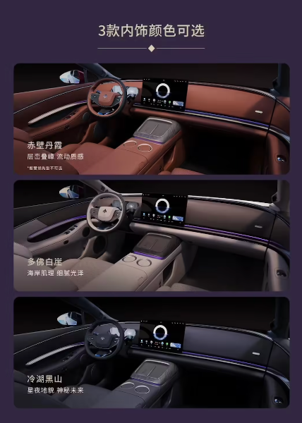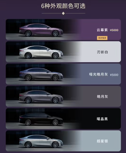 配色方面提供6种颜色:云幕紫、刃影白、哑光皓月灰、皓月灰、曜晶黑、超星银。其中云幕紫和哑光皓月灰在盲订期间限时免费选装,平时选装要加5000元。