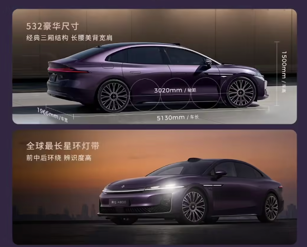 智慧领航旗舰型:增加双腔空悬、RNC+ENC主动降噪、副驾零重力座椅、后排“2+1”尊享座椅、全车机械按摩、电动睡眠头枕、华为XPIXEL百万像素投影大灯、14气囊、冷暖冰箱、等离子;领航四驱旗舰型(顶配):四激光雷达ADS V4.1、三电机四驱、4.4秒加速、20英寸7孔碟式轮毂+悬浮LOGO。