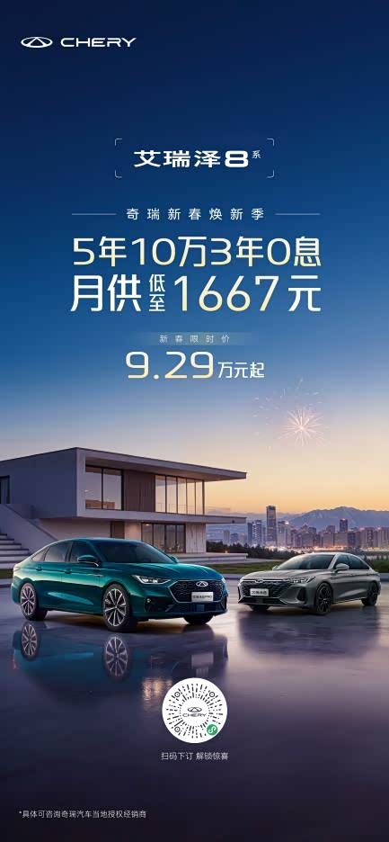 岁序更替,万象启新。奇瑞新春焕新季重磅启幕,携真金白银的诚意福利,为全国消费者献上新春购车厚礼。作为A+级燃油家轿市场的标杆力作,艾瑞泽8系率先发力,新春限时价9.29万元起,以满满诚意与硬核实力,承包消费者一整年的顺畅出行。