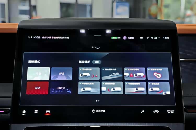 内饰方面,新车提供“马会庄园”和新增的“烟波浩渺”两种内饰主题。车内配备12.3英寸全液晶仪表和14.6英寸中控屏,搭载水晶电子挡杆。车机系统采用ADiGO Space超感交互智能座舱,内置高通骁龙8155车规级芯片,支持华为云桌面、四区语音控制等功能。