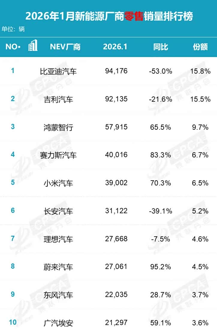 第三名鸿蒙智行零售57915辆,同比增长65.5%,市场份额达到9.7%。作为新能源市场中少数保持强势的品牌,鸿蒙智行凭借华为智驾、鸿蒙座舱的技术优势,在春节前购车潮中持续吸引高端家庭与科技用户。