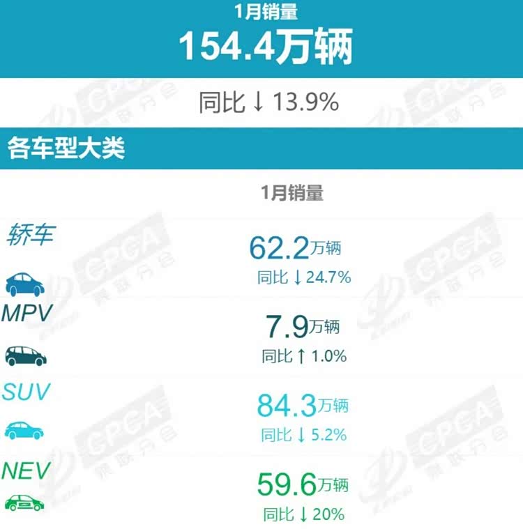 具体到细分市场,1月各领域表现差异显著,轿车市场下滑最为明显。数据显示,1月轿车销量为62.2万辆,同比大幅下降24.7%;作为乘用车市场的主力细分领域,SUV市场虽同样面临下行压力,但表现优于轿车市场,该月销量为84.3万辆,同比下滑5.2%;1月的MPV市场依旧是各细分领域中表现较弱的板块,销量同比小幅上涨1.0%达到7.9万辆;新能源车方面,由于购置税免税政策在2025年底结束,部分用户提前购买形成年底的消费透支现象,从而抑制1月新能源车市场的需求,销量仅59.6万辆,同比下滑20.0%。