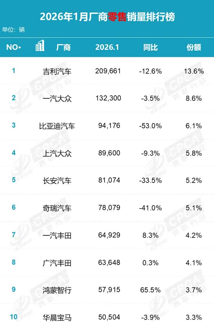 数据显示,1月自主品牌头部企业普遍面临较大下行压力,吉利(209661辆)、比亚迪(94176辆)、长安(81074辆)、奇瑞(78079辆)等均出现不同程度的同比下滑,其中比亚迪同比下滑达53%,主要受2025年12月新能源汽车车辆购置税免税政策退出后,消费需求提前透支的影响。尽管吉利汽车登顶销量榜首,但同比仍下滑12.6%,其成绩主要得益于银河系列等主力车型的稳定表现。