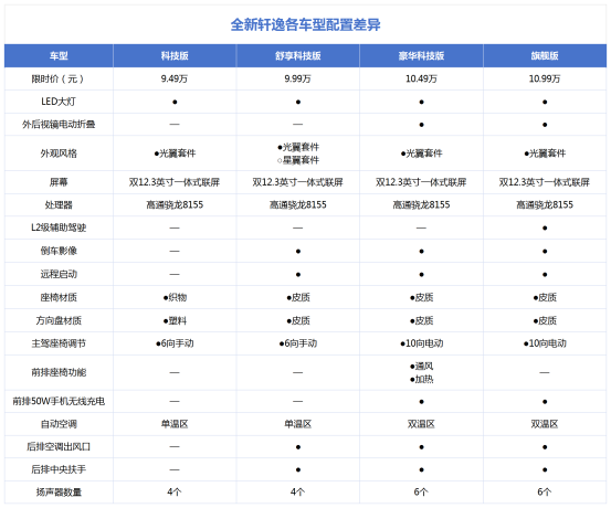 全新轩逸共有4款车型可选,分别是科技版、舒享科技版、豪华科技版和旗舰版,每款车型之间价格都相差5000元,差价不大那么配置差异又如何呢?舒享科技版相较于科技版在方向盘、档把以及座椅材质上都升级成了皮质,并且新增了倒车影像、远程启动、后排扶手和后排出风口。