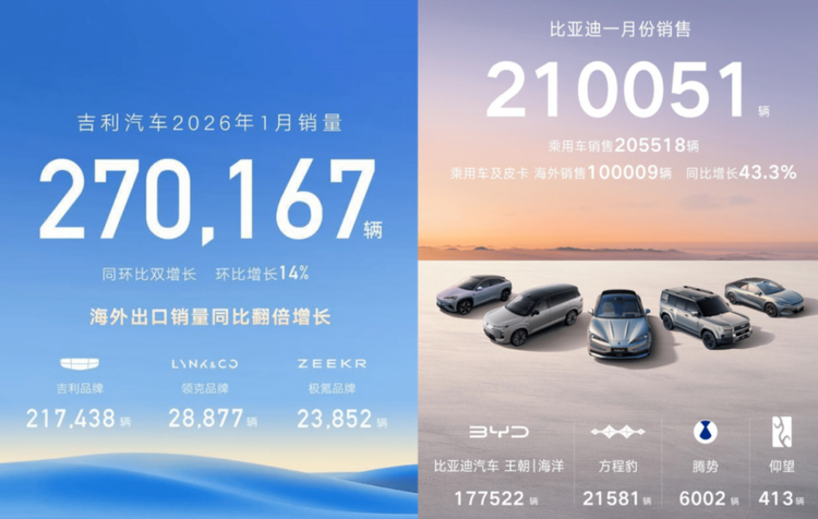 从品牌格局来看,市场分化正在加剧。2026年1月,吉利汽车以27万辆的销量反超比亚迪,成为新的月度销冠。吉利的优势在于“燃油+新能源”双线并行的战略,新能源销量占比达到46%,海外出口同比增长121%,占总销量比重接近四成。比亚迪虽然国内销量大幅下滑,但海外销量达到10.05万辆,同比增长51.47%,出口占比已接近一半,这为其提供了新的增长空间。