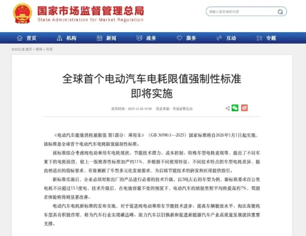 更值得关注的是,一系列强制性国家标准的密集实施,这将从深层次重塑行业竞争格局。1月1日起实施的《电动汽车能量消耗量限值第1部分:乘用车》(GB36980.1—2025)被称为“史上最严电动车能耗国标”,要求比上一版标准加严约11%。这意味着车企必须在电池技术、车身轻量化、能量管理等方面进行技术升级。虽然短期会增加成本,但长期来看将推动行业向更节能的方向发展。