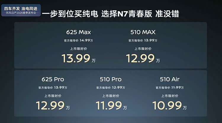 车家号·0浏览·2026-02-25 14:56 · 广东日前,东风 日产N7(参数|询价)青春版正式上市,新车推出5款车型可选,指导价区间11.99万-14.99万元,限时10.99万-13.99万元。