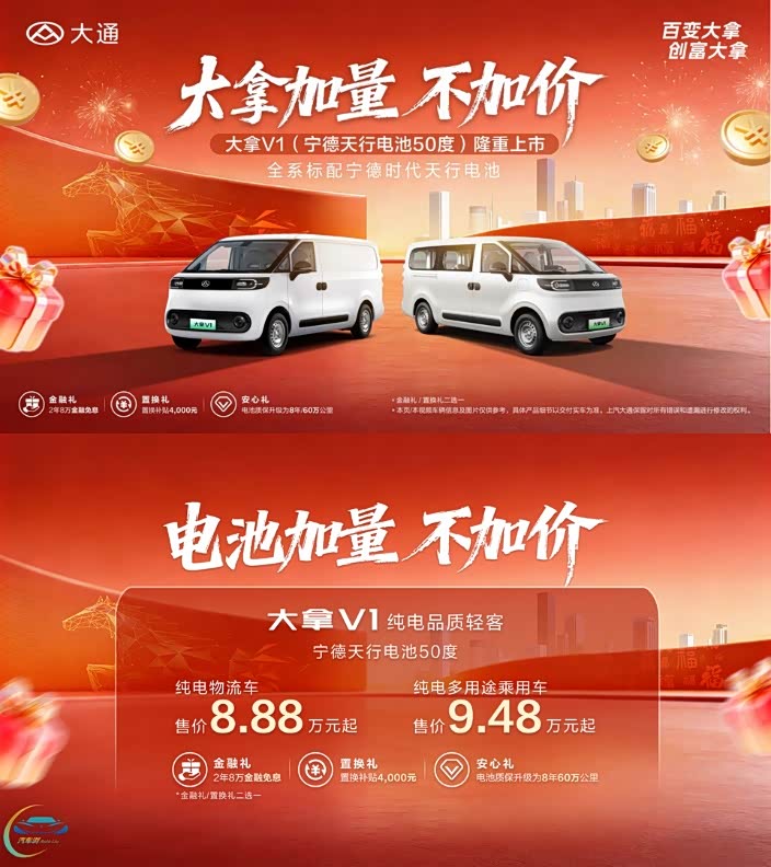 2月25日,大通旗下明星车型 大拿V1(参数|询价)(宁德天行电池50度)正式上市,在保持价格不变的前提下,新款车型从电控、续航到质保政策全方位升级,更给出了21分钟快充系统,为策马奔腾的创富人群提供了更高效的选择。