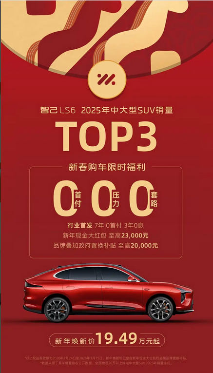 日前,我们从上汽乘用车官方获悉, 智己LS6(参数|询价)公布焕新价格体系,起售价调整至19.49万元,同时叠加现金补贴及金融方案。官方给出的现金优惠2.3万元,并提供7年0首付、3年0息的分期政策,叠加5000元品牌置换补贴,若符合地方政府置换政策,综合补贴额度最高可至2万元。对于预算在20万元区间、希望通过金融方式降低首付压力的用户,这一价格与金融组合方案具备现实“吸引力”。结合当前新能源SUV市场的定价区间来看,智己LS6在终端层面的门槛进一步拉低,购车成本结构更偏向理性家庭用户。