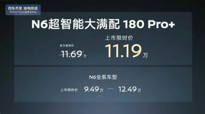 车家号·0浏览·2026-02-25 15:38 · 黑龙江日前,Auto情报处从东风日产官方处获悉,东风日产N6 180 PRO+版本正式上市,日产N6定位中型车,搭载1.5L插电混动系统,180 PRO+版本共推出1款配置,指导价为11.69万元,限时11.19万元,CLTC纯电续航里程为180公里,180 PRO+还提供Momenta辅助驾驶系统。