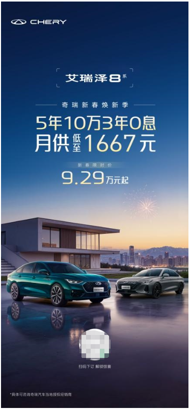 新春启新,福伴同行。正值购车黄金期,奇瑞汽车以新春焕新为契机,凭借极具竞争力的价格、行业领先的技术,向市场彰显了民族品牌的温度与担当。对于广大消费者而言,当下正是入手艾瑞泽8等优质车型,“0压”启程、轻松开启高品质出行生活的绝佳时机。