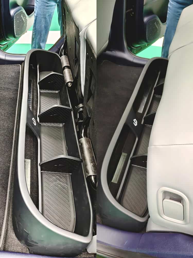 第四,是第二排这张玩法多变的魔术座椅。就像本田飞度那样,A10的第二排座椅可以整体折叠翻折起来,方便安置大型宠物或是植物。另外,车主还可以选装座椅下方的隐藏式储物槽,虽然只是简单的塑料隔板,但有了橡胶打底和限位后,也能避免行驶过程中储物槽内的物品发出碰撞噪音——实际上,要不是现场零跑工作人员介绍,我压根没发现这个“隐藏储物模式”。