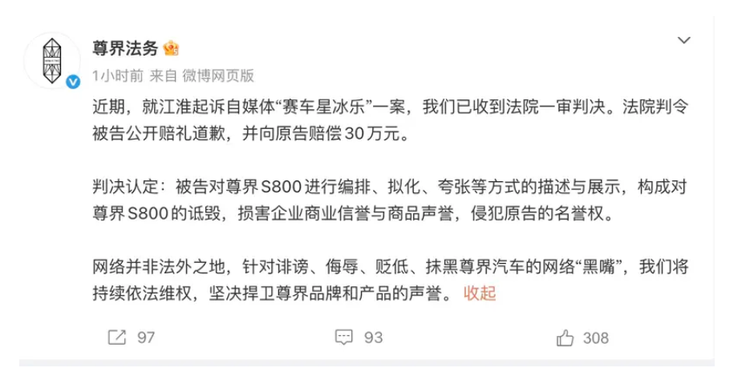 当新势力品牌遭遇舆论攻击,尊界以法律手段建立威慑。30万元赔偿与公开道歉的组合,既是对个案的惩戒,也是向潜在侵权者释放的信号:在智能电动车竞争白热化的当下,品牌声誉的司法保护已成为企业战略的重要组成部分。