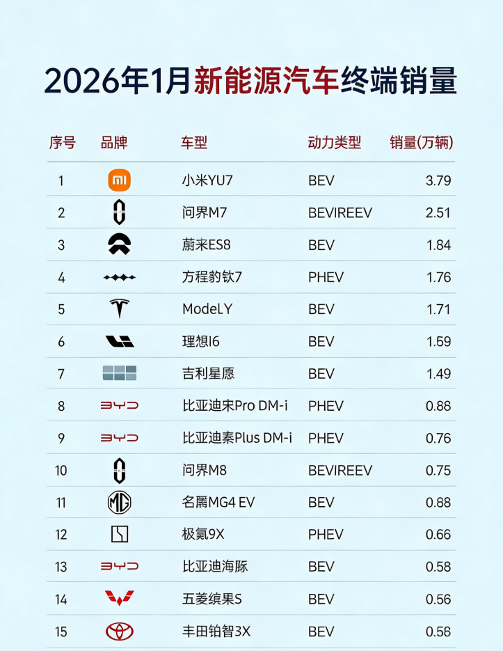 - 2026年1月:YU7 37,869台 vs Model Y 16,845台(YU7大幅领先)