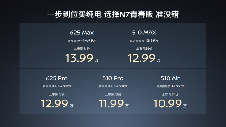 在本次发布会上,东风日产N7推出青春版车型,新车共推出5款车型,官方售价为11.99-14.99万元,上市限时价为10.99-13.99万元。外观设计上,新车依然沿用现款车型设计风格,动力上采用前置前驱单电机,最大功率为160千瓦,最大扭矩305牛·米,配备欣旺达磷酸铁锂电池,CLTC纯电续航540km。