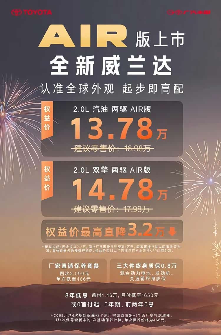 2月24日,广汽丰田旗下全新 威兰达(参数|询价)新增AIR版车型并正式上市,新车共推出2款车型,入门版2.0L汽油AIR版建议零售价为16.98万元,权益价为13.78万元;2.0L混动AIR版建议零售价为17.98万元,权益价为14.78万元。简单来说,相比于建议零售价,新车权益价最高直降了3.2万元。