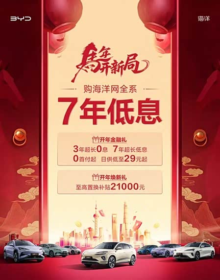 每天花费不到一杯奶茶的钱,就能把一辆新能源车开回家——这不是营销噱头,而是马年车市正在上演的真实场景。2月25日,比亚迪宣布旗下海洋网全面推行“七年低息”购车方案,日供最低仅需29元。据不完全统计,从年初至今已有超过20个汽车品牌加入这场围绕消费者钱包展开的“金融战”,一场前所未有的超长期购车贷款竞赛正在全面铺开。