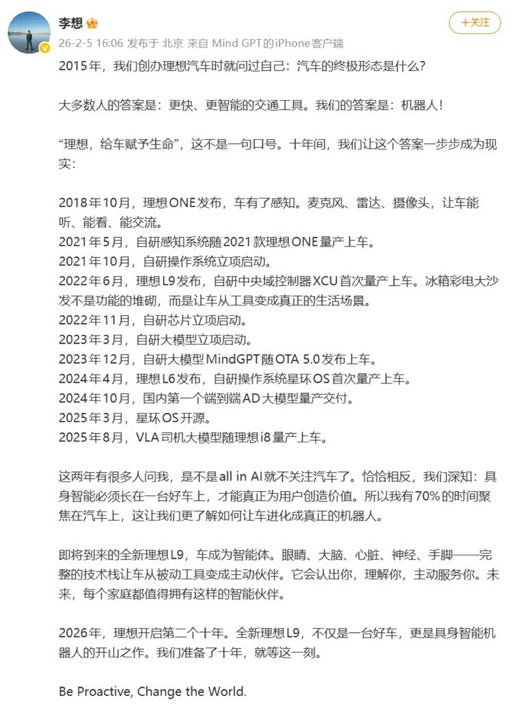 告别,有时是为了更好的出发;调整,是为了更精准的聚焦。理想的下一程,将不再局限于公路,而是深入人工智能的无限赛场。一切过往,皆为序章。所有目光,请投向那正在加速到来的、由AI与机器人重新定义的未来。