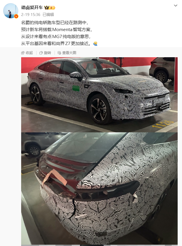 2 月 25 日,微博博主 @德卤爱开车 放出了一组上汽名爵全新轿车的路试谍照。这台车目前还没正式发布,但从已经曝光的细节来看,方向还是挺明确的——主打运动风格,而且明显往智能化那条路上靠。