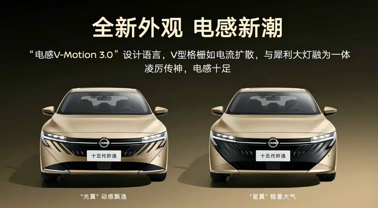 第15代轩逸采用了全新的外观设计,V-Motion 3.0设计更加无边界感,还有提供“光翼”与“星翼”双前脸,看上去更加年轻运动。另外,新车尺寸也有不同程度增加,其长宽高分别为4656/1825/1448mm,轴距不变仍为2712mm。
