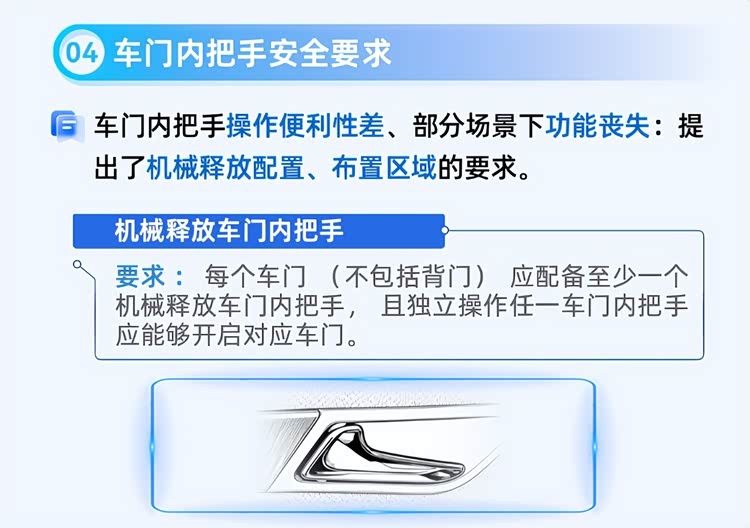 最新的强制性国标《汽车车门把手安全技术要求》(GB 48001-2026)要求车门把手必须配备机械释放装置,而且车门外把手必须预留不小于特定尺寸(约30立方厘米)的手部操作空间,从2027年1月1日起开始实施,已经获得型式批准的车型需要在2029年1月前修改其设计。