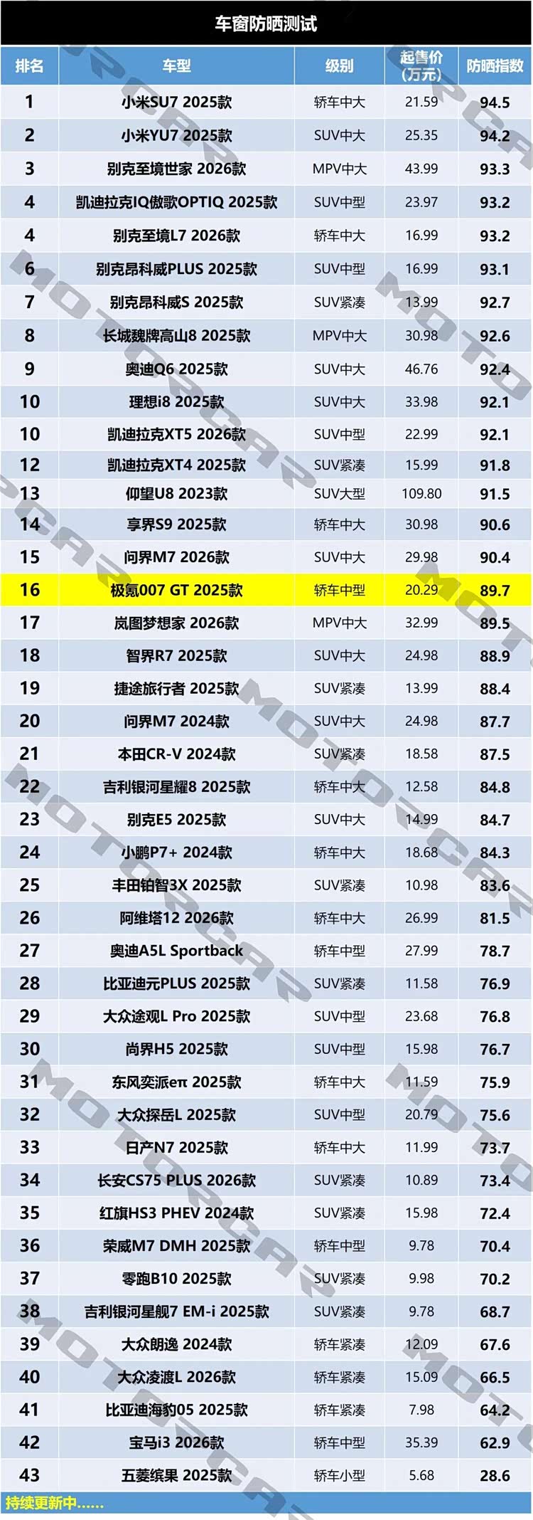 按照测试模型计算下来,极氪007GT 2025款全车防晒指数为89.7分,在目前的测试排名中暂时排名第16,在市面上属于中上水准。