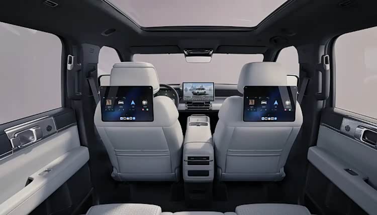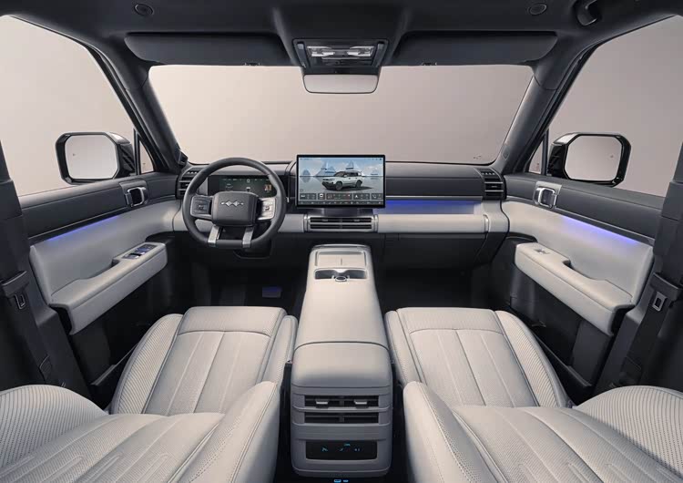 内饰方面,这款车的配置非常丰富,但用料有一点小遗憾,门板和中控台大面积使用硬质塑料,摸上去会有点廉价感,可能与它的硬派定位相关吧。不过座椅配置非常良心,全系标配真皮舒芙蕾座椅,质感柔软舒适,包裹性很好。仪表盘配备的是12.3英寸全液晶仪表盘,显示清晰,能实时呈现续航、能耗、动力模式等信息;中控屏幕是15.6英寸悬浮屏,搭配26英寸W-HUD抬头显示,形成三屏交互,操作流畅,支持语音控制、CarPlay/HiCar互联、在线导航、娱乐影音等功能。另外还有多功能方向盘、电子挡把,操作便捷,科技感十足。