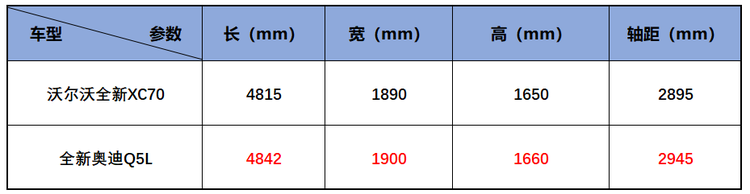 再来看看两款车的车身尺寸,沃尔沃全新XC70的长宽高分别为4815/1890/1650mm,轴距为2895mm;而全新奥迪Q5L的长宽高分别为4842/1900/1660mm,轴距为2945mm。从参数上看,二者的体量在同级车中都是比较突出的,不过后者在轴距上更占优势,这也为内部空间提供了更多可能。
