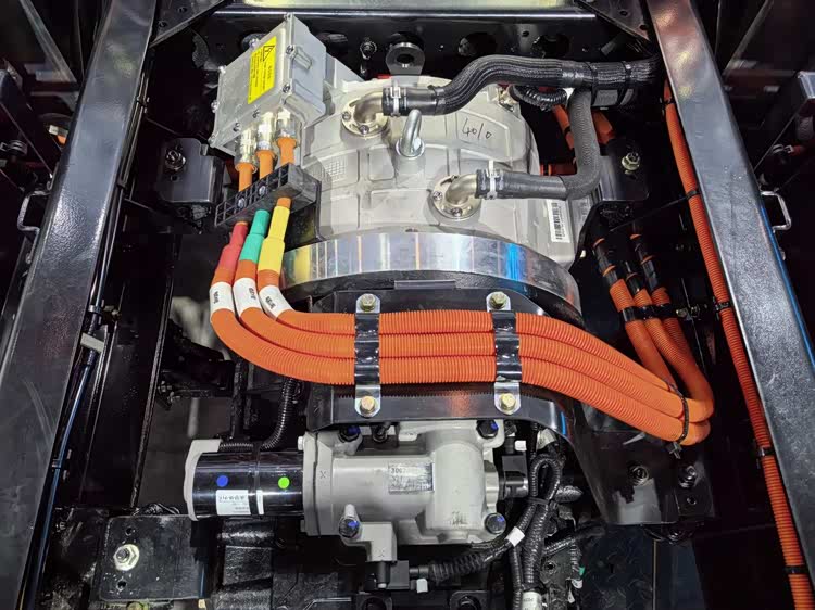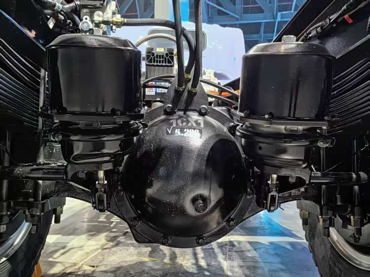 首先说动力系统,解放虎6G搭载1200N·m大扭矩电机+专属4挡变速箱。这套黄金动力组合,不是简单的电机直驱,而是专门针对重载工况标定的专业电驱总成,通过变速箱的精准变速,车辆轮端扭矩直接做到30000N·m,起步有劲、爬坡有力,满载渣土、砂石也能轻松起步,不溜车、不乏力。同时车辆标配差速锁,脱困能力大幅提升,真正做到烂路敢走、重载敢拉、复杂工况不掉链子。