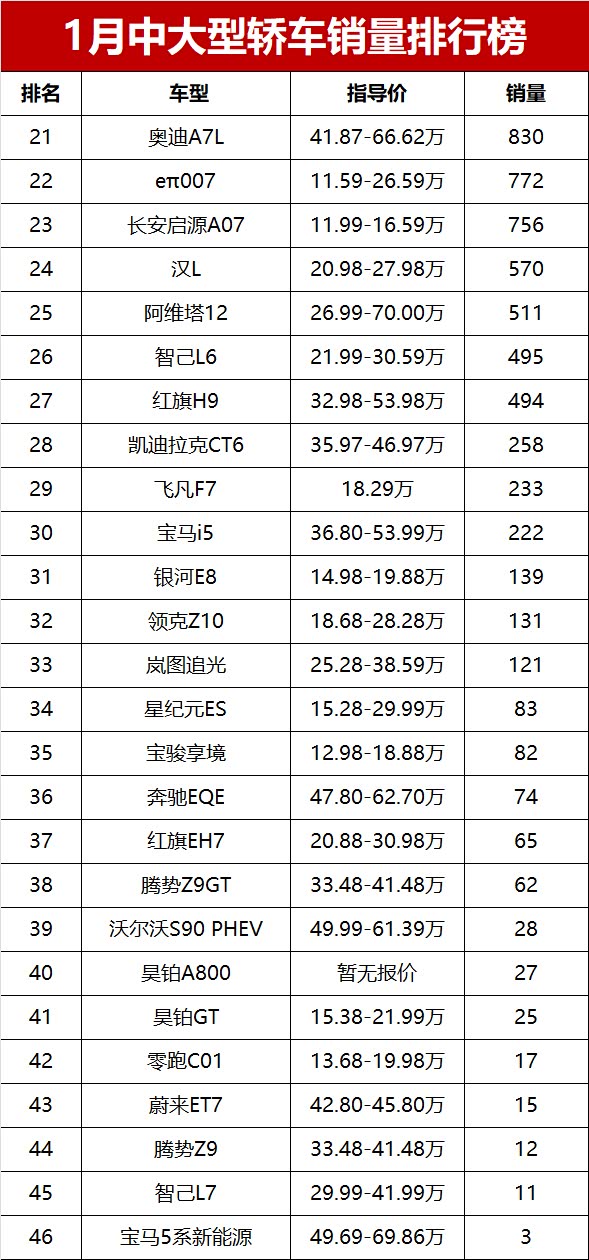 多款昔日热门车型销量惨淡。红旗H9 494辆排第二十七,表现配不上其国产豪华定位;凯迪拉克CT6 258辆排第二十八,销量一落千丈;蔚来ET7等高端新能源车型销量不足20辆,其中宝马5系新能源仅售3辆排末位,几乎无人问津。整体来看,1月中大型轿车市场呈现“豪华合资霸榜、自主遇冷、新能源低迷”的态势,开年表现惨淡,后续市场能否回暖仍存疑。
