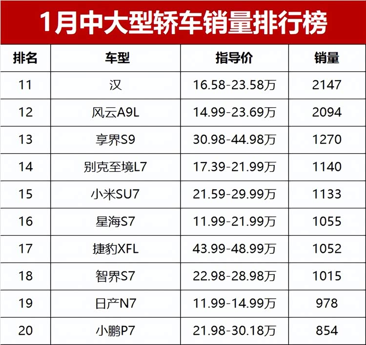第十至十二位销量均在两千辆左右。沃尔沃S90 2157辆排第十,靠沉稳外观和出色安全性圈粉,销量符合自身定位;比亚迪汉意外大跌,2147辆排第十一位,销量不及巅峰时期零头;风云A9L 2094辆排第十二,在国产混动市场占据一席之地。