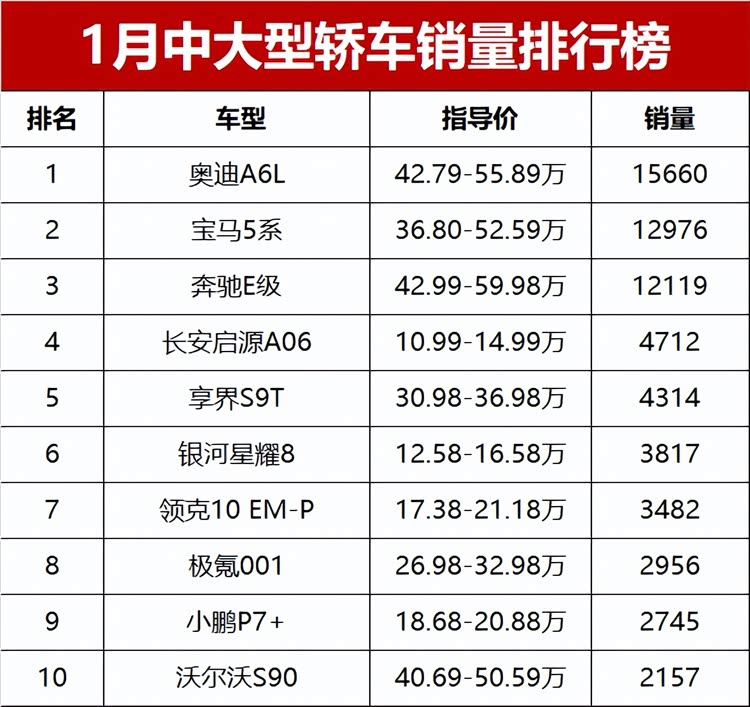 【2026年1月中大型轿车零售销量排行榜】开年车市遇冷!乘联会数据显示,2026年1月国内轿车零售销量62.2万辆,同比大跌24.7%。中大型轿车细分市场同样疲软,仅3款车型销量破万且均为合资豪华品牌;自主品牌表现惨淡,销量最高的国产中大型轿车未达5千辆,反观上月还有9款国产车型销量超5千辆,差距显著。新能源完败!1月中大型轿车销量榜,奥迪A6L夺冠,比亚迪汉跌出前十!