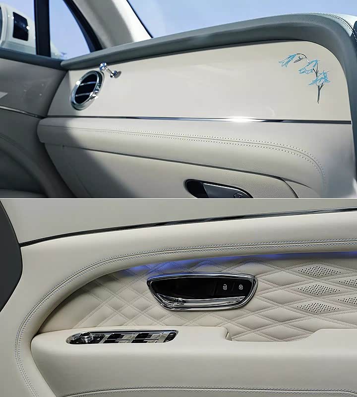 内饰方面 Bentayga Something Blue Collection by Mulliner 则是恰到好处地延续了蓝色的主题,不仅座椅椅背绣有蓝色的宾利厂徽,中控仪表还饰有精致的蓝色花卉图案。