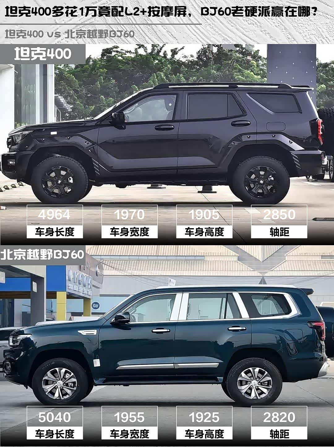 最后说价格💰 坦克400贵1万但多出:电动天窗、座椅按摩、L2辅助驾驶、更大中控屏...个人觉得这波加装超值!当然如果你就爱BJ60的经典方盒子造型,它终身免费保养的政策也挺香。