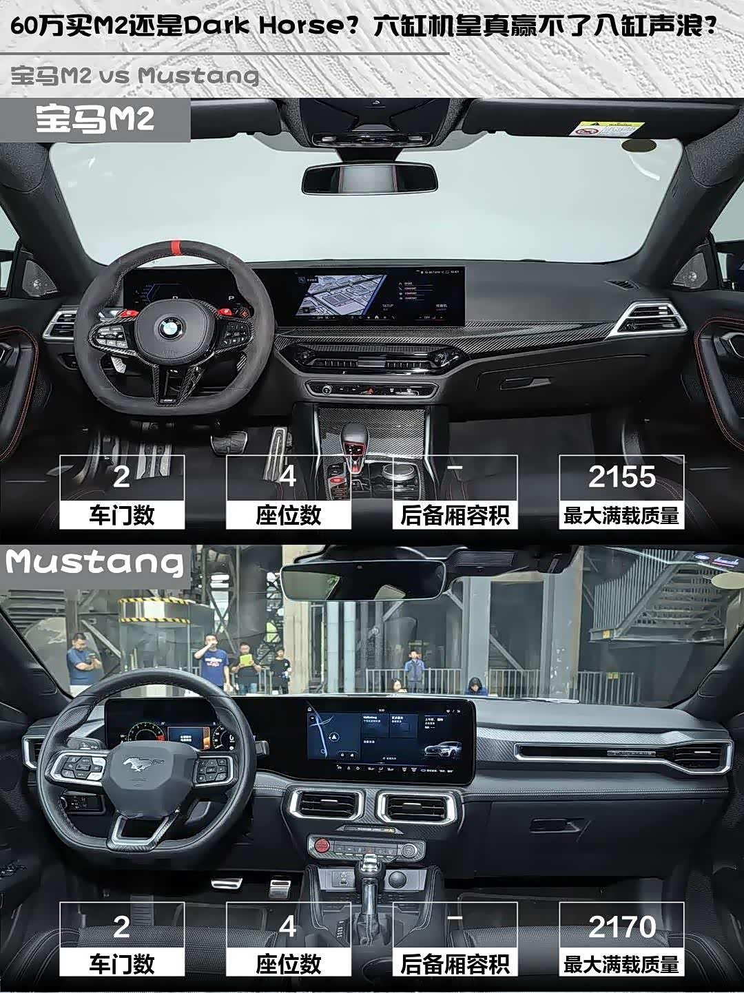 要极致操控选M2,要美式情怀选Dark Horse。60万预算买M2性价比更高,但V8自吸的情怀无价!最后说个冷知识:M2油箱52L,Dark Horse有60L,但两台车都是"不是在加油就是在去加油站的路上"的货色⛽️