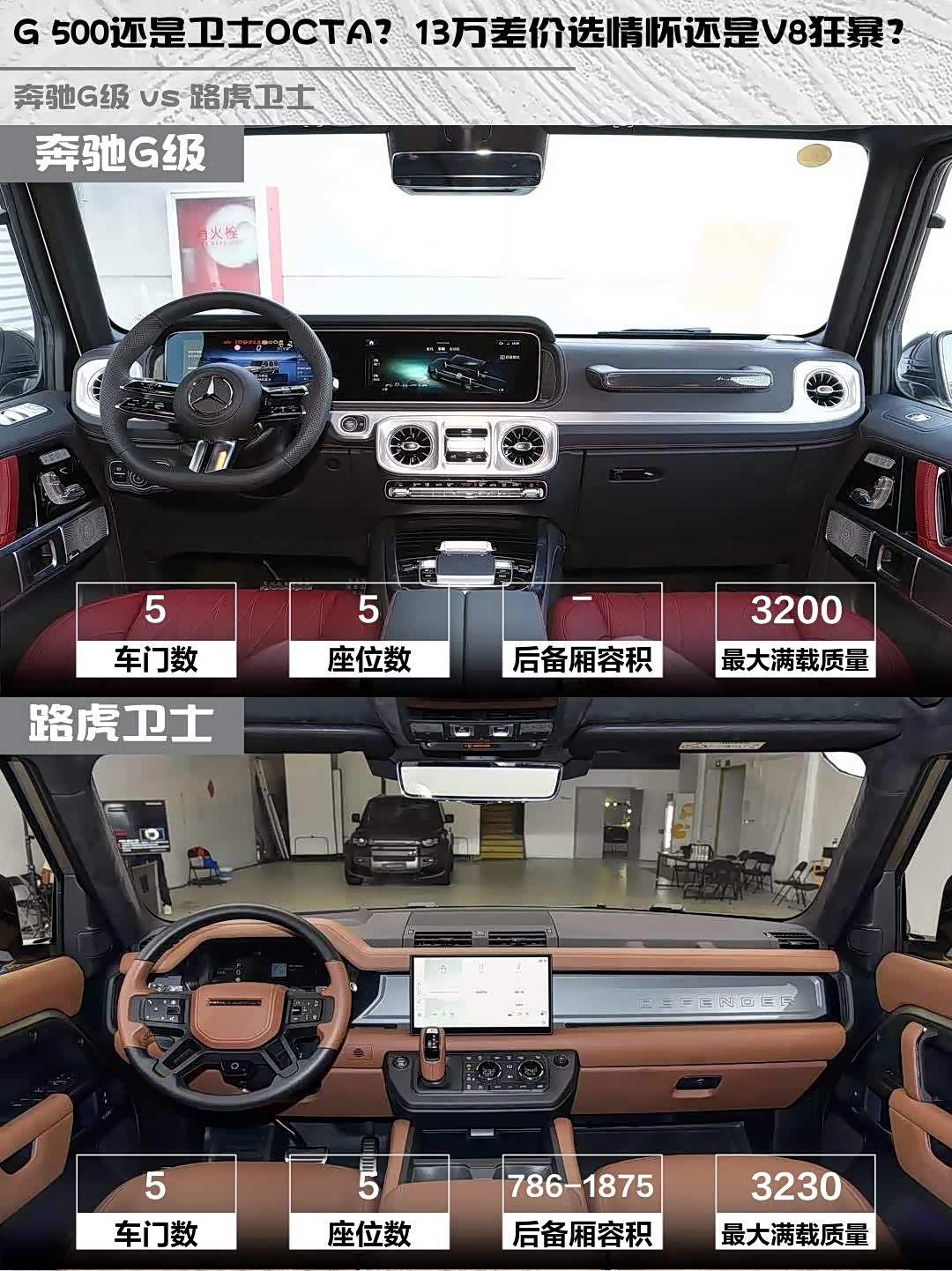 G 500保留实体按键+12.3英寸触控屏,怀挡设计致敬经典。卫士13.1英寸曲面屏+全触控操作更前卫,但车机卡顿老车主都懂…📱 奔驰的L2级驾驶辅助标配360影像,卫士多出透明底盘,新手越野更友好。储物空间方面,卫士后备箱786L起完胜,G级后排暗格设计略显局促。