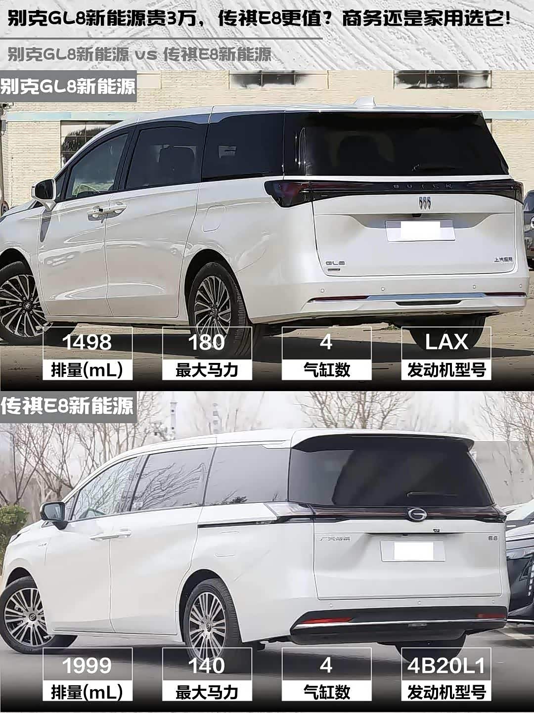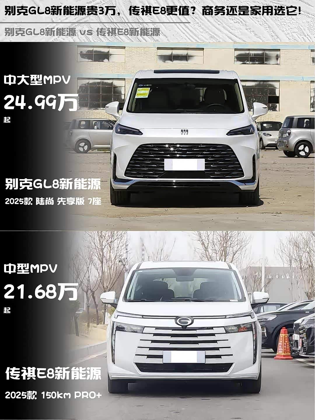 车家号·0浏览·2026-02-26 08:53 · 北京最近在帮朋友挑新能源MPV,深度对比了 别克GL8新能源(参数|询价) 2025款 陆尚 先享版 7座和传祺E8新能源 2025款 150km PRO+,发现这两台车简直是家用和商务的两种解题思路!🚗💨