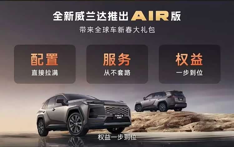 全新换代威兰达AIR版在13-15万级紧凑SUV市场强势出击,为消费者献上诚意十足的"全球车新春大礼包",2.0L汽油AIR版权益价为13.78万元,2.0L混动AIR版权益价为14.78万元,亲民的售价,搭配"入门配置拉满"的高规格产品力、全国统一价的“厂家直销保养套餐”以及长达8年超长期低息金融方案,从购车、养车、用车全周期直接痛点,从产品、营销、服务等方面层层叠加附加值,为用户打造全周期用车新价值。