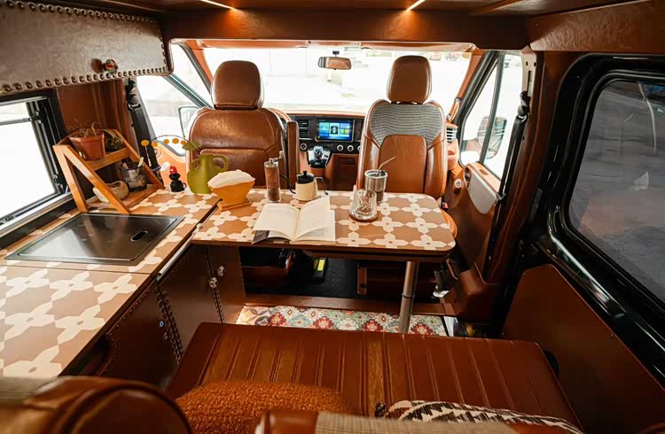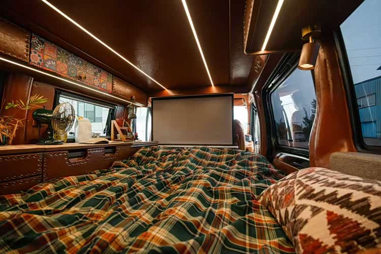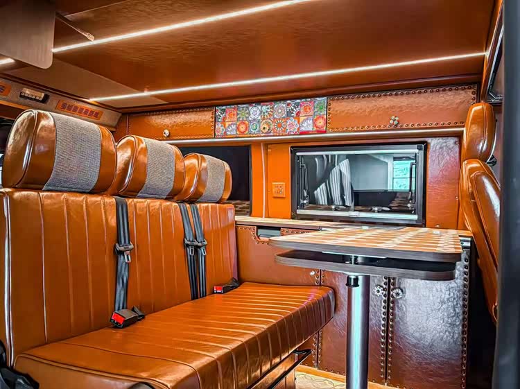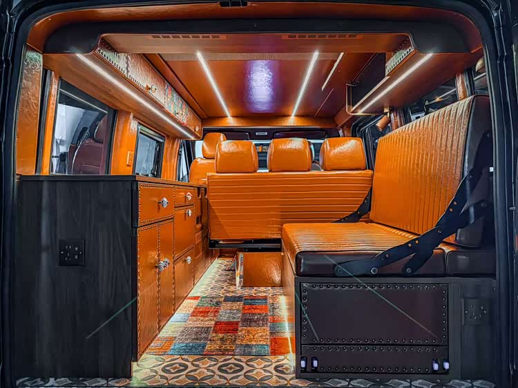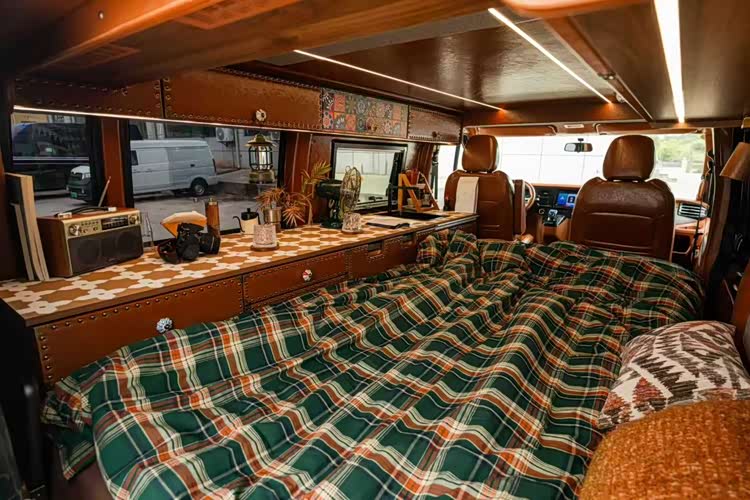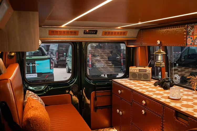 美式复古外观:复刻上世纪旅行车经典轮廓,哑光军绿与焦糖棕双拼配色,搭配镀铬饰条与黄铜质感部件,颜值辨识度拉满,告别商用车刻板形象。一车多能百变空间:通勤时是舒适5座车,露营时秒变旅居舱,办公、休憩、社交场景自由切换,兼顾家用与户外需求。细节人性化设计:全车双层隔音保温,配备驻车空调、石墨烯地暖,高原版适配多种环境;座椅舒适、布局合理,长途驾乘不疲惫。5座设计,二三排可放平成1.3m×2.2m大床,副驾可旋转形成会客区。