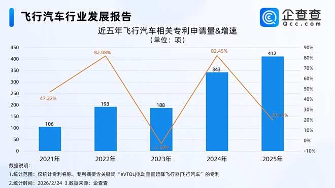 从飞行汽车专利更能看出其热闹程度。企查查数据显示,截至目前,国内飞行汽车相关专利达1707项,其中超七成相关专利申请于近五年(2021年及以后)。其中2024年、2025年飞行汽车相关专利申请量连续两年超300项,2025年相关专利申请量达412项,同比增长20.12%。